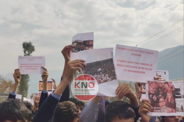 Ganderbal, Oct 23: Scores of students on Wednesday held a protest in Kangan area in central Kashmir's Ganderbal district over killing of seven people in a terror attack in Gagangeer…